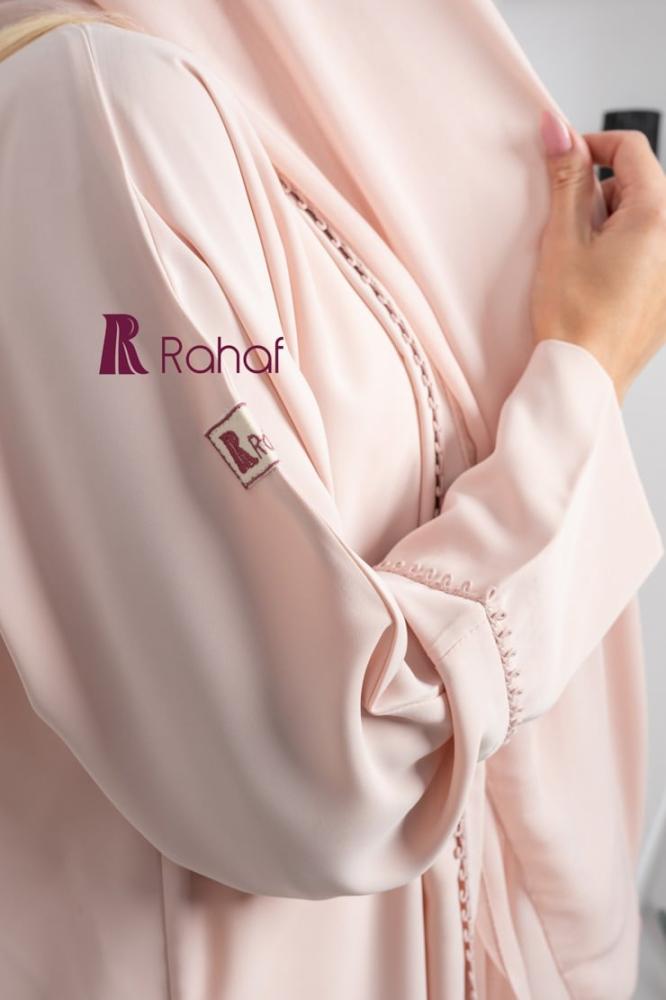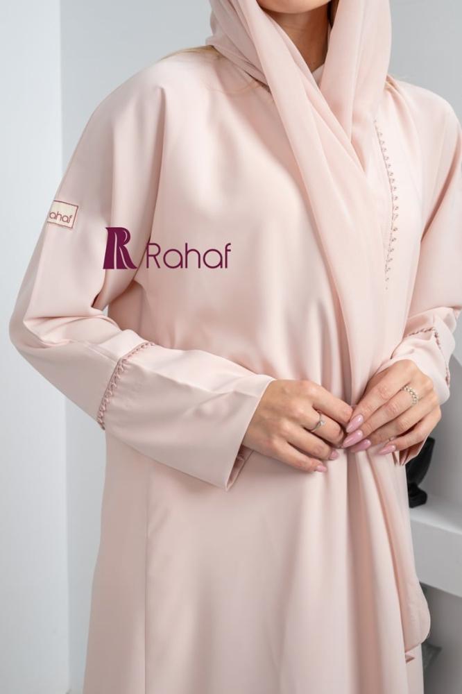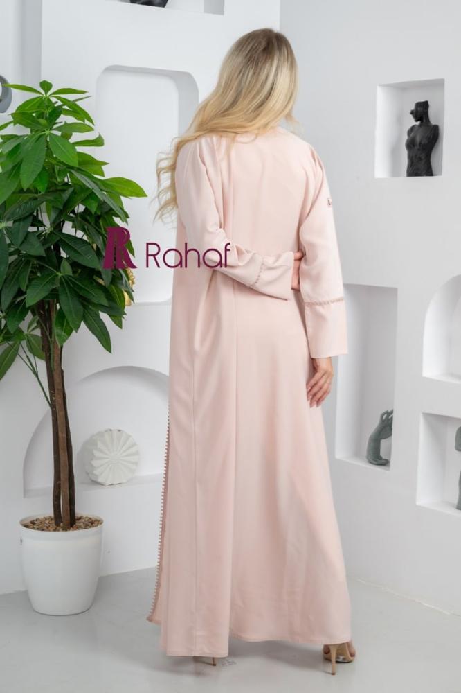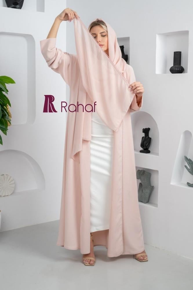 تألقي بإطلالة أنثوية ناعمة وفاخرة مع عباية سترايت مصنوعة من قماش الحرير البارد بلون الزهري الفاتح.
