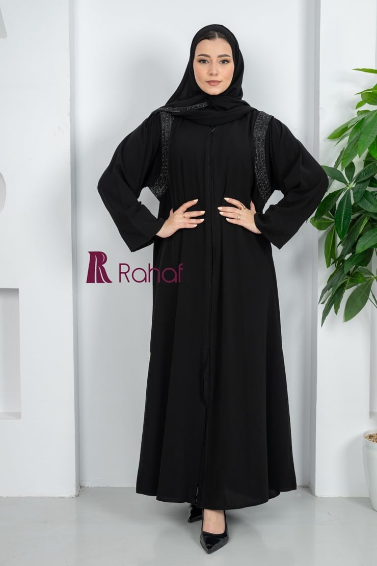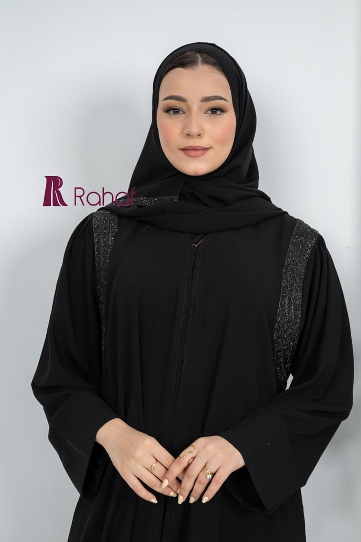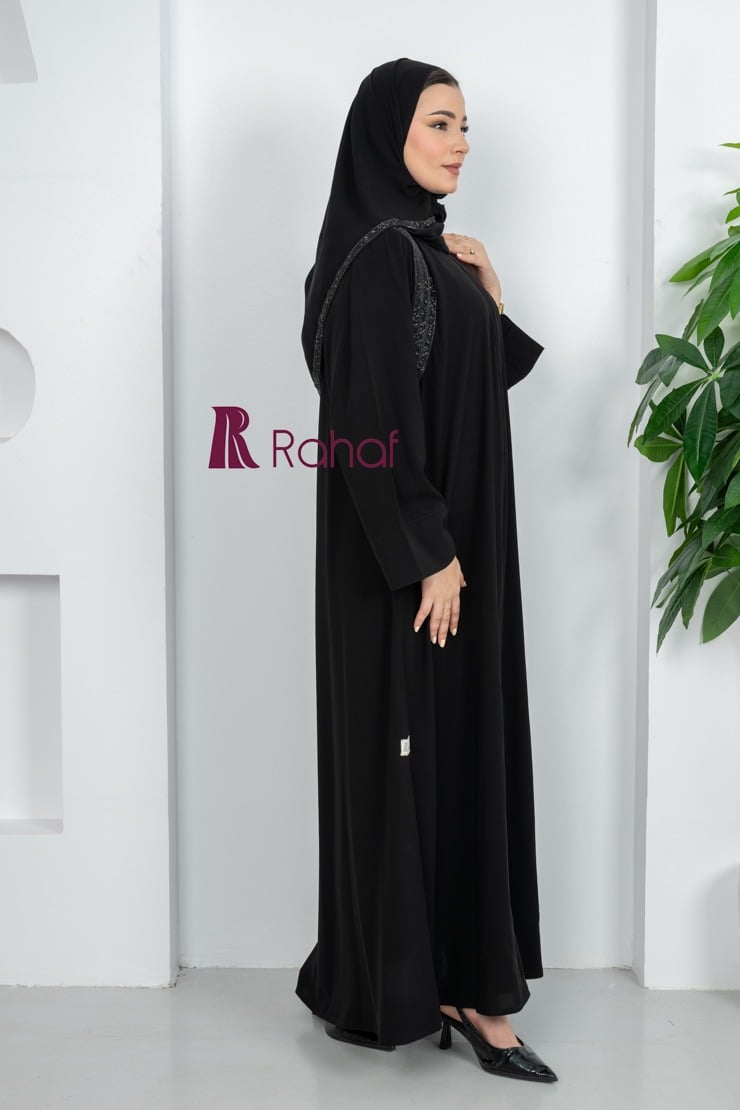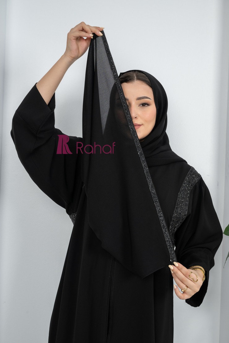 يزين العباية تطريز أسود أنيق على اكتاف والأطراف الطرحه يمنحها لمسة فخمة تضيف عمقًا وجاذبية للتصميم، مع تشطيب دقيق يعكس جودة الصناعة السعودية.