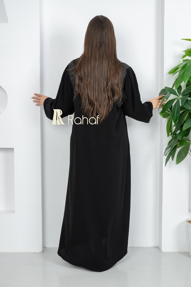 تألّقي بإطلالة راقية مع عباية الكريب الملكي المطرزة باللون الأسود، بتصميم يجمع بين الفخامة والبساطة.
