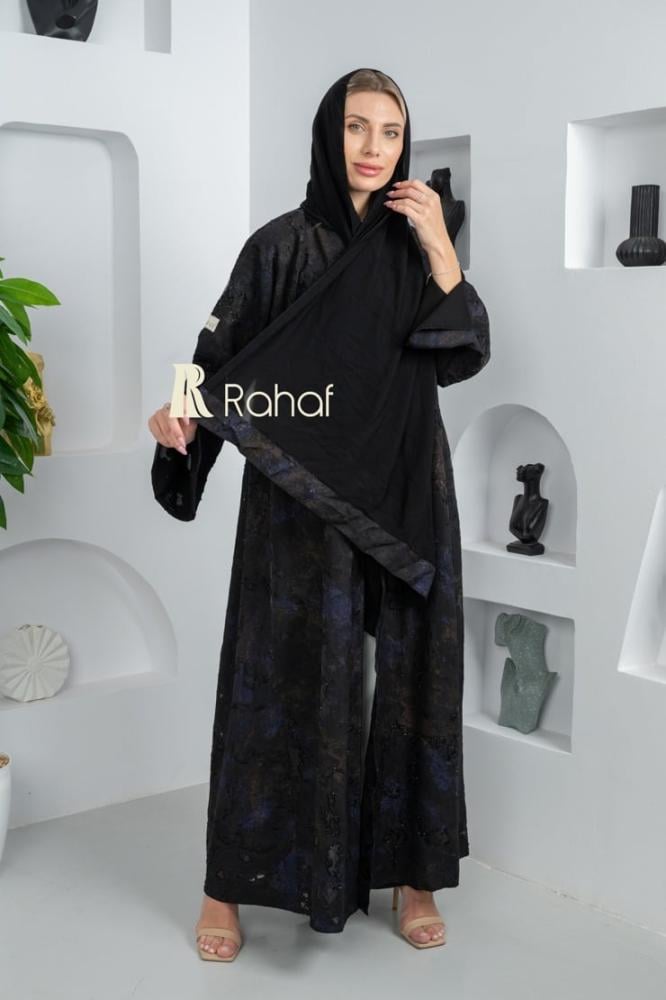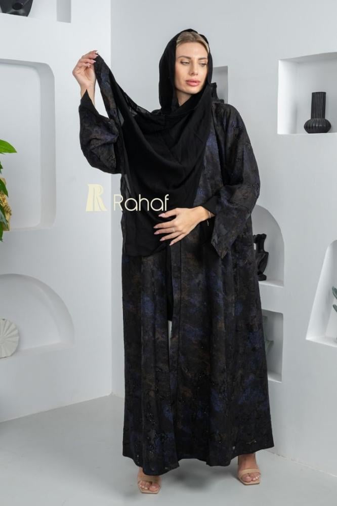 تألقي بإطلالة أنثوية راقية مع عباية شيفون باللونين الأسود والأزرق الغامق، مصممة بموديل كلوش يمنح حركة انسيابية وأناقة فاخرة.